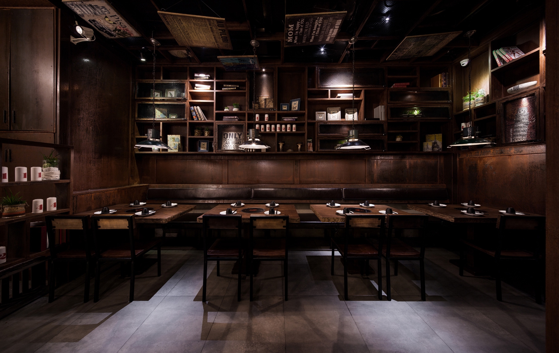 這家讓人感到精致和新意的砂師弟在廣州東方寶泰為食客們敞開了門,我們相信客戶們能感受到設計師的精心布置和設計理念。 本案設計師的主題是利用鐵板和鋼鐵的做舊處理,紅磚披白灰等元素演繹了一番新的時尚工業(yè)風,在這個快節(jié)奏摩登的時代,質(zhì)樸,原始,復古,經(jīng)典這種“舊”的文化反而深深被大眾們青睞,而能利用設計在大都市的心臟處為食客們創(chuàng)造一處,能暫時逃避繁忙的生活,這是該項目的初衷。 當你進入這個店,相當于進入了一個懷舊體驗區(qū),黑板上的Q人物畫為沉靜的餐廳注入鮮活因子,一個經(jīng)典的人物,喚起了多少人童時的記憶和樂趣,現(xiàn)實與經(jīng)典匯融在于此,創(chuàng)造出新的體驗。而銹跡斑斑的鐵藝與質(zhì)樸的水泥磚相結合,營造出灑脫,不被束縛的張揚個性,來吸引與味覺完美結合。軟裝內(nèi)飾上隨意搭配書籍,杯子等具有生活氣息的飾品,你會發(fā)現(xiàn)這里三一個輕松自在并有趣的就餐空間,如果你在這里,記得來體驗這令人垂延的牛腩煲哦!